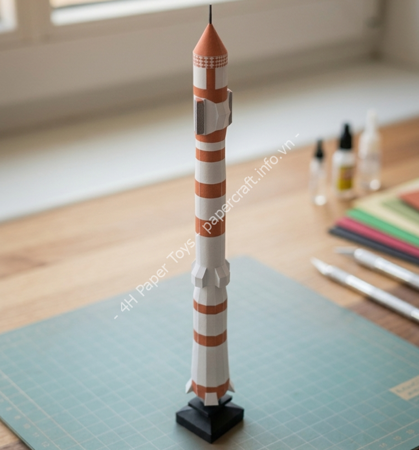 - Đổ trọng tâm: Mô hình dáng cao và mảnh, rất dễ đổ. Trước khi dán kín bệ đỡ ở dưới cùng, hãy dán thêm vài lớp bìa cứng (carton) hoặc nhét một ít đất sét nặn vào trong đế để hạ thấp trọng tâm, giúp tên lửa đứng vững chãi hơn.