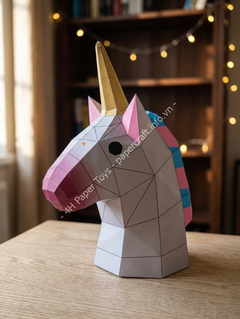 Lời khuyên: Chìa khóa để làm đẹp một mô hình Low-poly không nằm ở việc cắt, mà nằm ở việc tạo nếp gấp. Hãy sử dụng một chiếc bút bi đã hết mực, dùi đầu tròn, hoặc sống dao rọc giấy nhẹ nhàng miết (score) lên tất cả các đường gấp trước khi bạn bẻ chúng. Kỹ thuật này sẽ giúp các cạnh đa giác của kỳ lân sắc nét, thẳng tắp và giúp mô hình tự động “ôm” vào đúng form cứng cáp thay vì bị cong vênh.